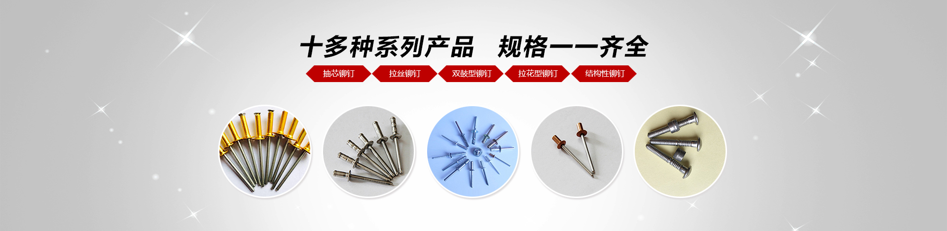 我們主要產(chǎn)品有:2.4-6.4的圓頭,沉頭(平頭),開口,封閉系列抽芯鉚釘(拉釘),還有燈籠鉚釘,拉絲鉚釘,雙鼓型鉚釘,拉花型鉚釘?shù)鹊冉Y構性鉚釘,材質有鋁,不銹鋼,鐵,銅;還有M3-M12的平頭,沉頭,小頭系列鉚螺母,有圓桿型、帶槽型、六角型(半六角)、盲孔型等,材質有鋁,不銹鋼,鐵,銅。